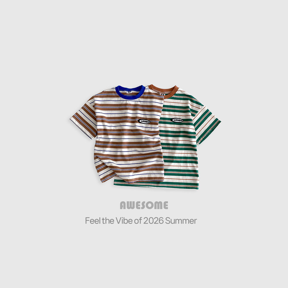 [85-140cm] 復古質感撞色細條紋貼標短袖T恤 #Pyxis 羅盤座