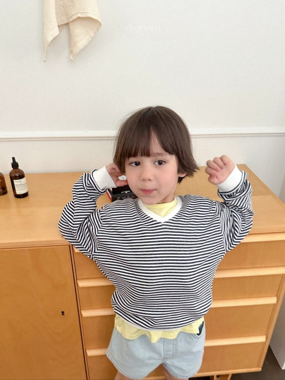 [85-130cm] 復古條紋撞色V領長袖T恤 #Taurus金牛座